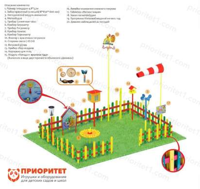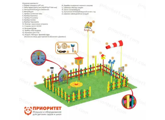 Метеорологическая площадка «Стандарт №1» для детей дошкольного и младшего школьного возраста. Научит ребенка любить природу, заботиться об окружающем мире. Для установки площадки подойдет открытая территория возле детского учреждения. Занятия на открытом воздухе помогают работе мозга, так как он лучше насыщается кислородом. Яркие цвета, в которые окрашен учебно-игровой комплекс, привлекут внимание и не отпустят от себя ни одного малыша. Площадка знакомит любознательного ребенка с погодными и природными явлениями, учит наблюдательности и работе с некоторыми приборами.