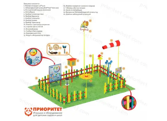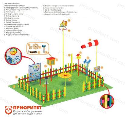 Метеорологическая площадка «Стандарт №2» - оборудование для детски общеобразовательных учреждений, а также для дополнительного и коррекционного развития. Устанавливается на ровном участке открытой местности. Периметр учебно-развлекательной площадки ограждается секциями цветного забора, внутри которого устанавливается необходимое оборудование.