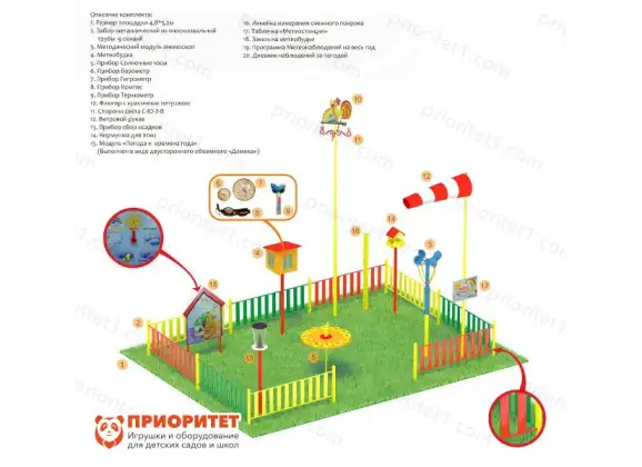 Метеорологическая площадка «Стандарт ПЛЮС №1» устанавливается во дворах и на территории детских учреждений для ознакомления с принципами работы метеоприборов. Учит ребенка любви и бережному отношению к окружающему миру. Подходит для занятий детям с ОВЗ.