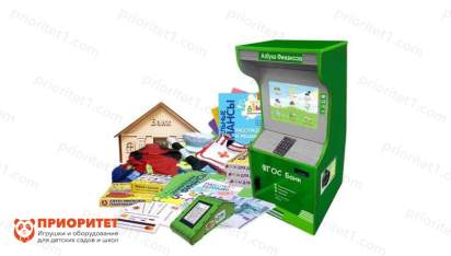 - Комплекс включает условно-мобильный банкомат, который оснащен высокопроизводительным компьютером и монитором, что позволяет реализовать уроки в автономном режиме, без необходимости использования интерактивной доски.