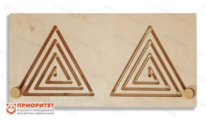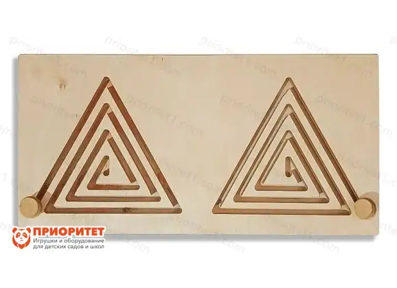 Межполушарная доска №8 представляет собой деревянную панель с размещенными на ней двумя лабиринтами треугольной формы. По краям дорожки широкие, а ближе к центру они сужаются. Не только детям будут полезны занятия с неротренажером, но и взрослым. Главная задача нейротренажера – наладить взаимодействие между обоими полушариями мозга для его правильной работы. Следствием этого станут улучшение общего состояния организма, развитие умственной и эмоциональной сфер человека.