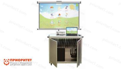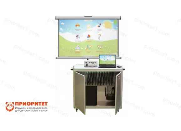 - Ноутбуки детей хранятся в мобильной передвижной тележке, которая предусматривает быструю подзарядку устройств.