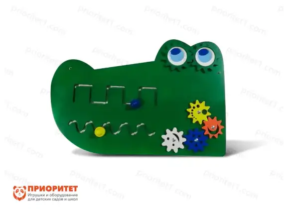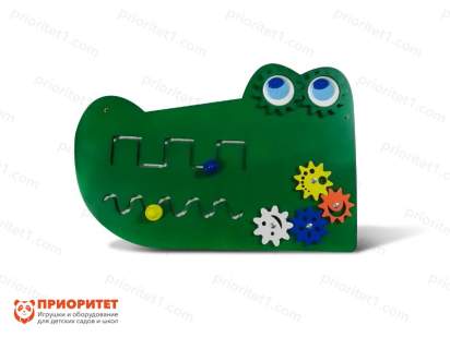 Модуль выполнен в форме плоской головы крокодила. Он может являться как самостоятельным элементом, так и в совокупности с остальными частями. Яркий зеленый цвет привлекает детское внимание, не раздражает глаз и дарит спокойствие. Крутящиеся шестеренки помогают детям развивать моторику, логическое мышление, координацию и понимание причинно-следственной связи. Модуль подходит для развивающих игр в дошкольных учреждениях и в домашних условиях.