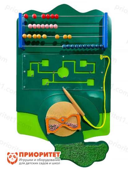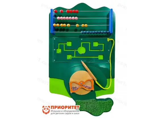 - Под счетами находится магнитный лабиринт, закрытый прямоугольником из прозрачного пластика. Металлические шарики по лабиринту перемещаются при помощи специального стилуса с магнитным наконечником. Стилус крепится шнурком к месту соединения пластиковой поверхности с основой модуля. Играя с лабиринтом, дети учатся ориентироваться в пространстве, искать решение для поставленной задачи и думать логически, прокладывая путь для шарика.