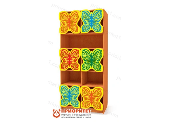 - Стенка выполнена в дизайнерском стиле «Бабочка», где массив имеет обычную форму, а дверцы сделаны в форме бабочек. Сверху приклеены наклейки разноцветных бабочек.
