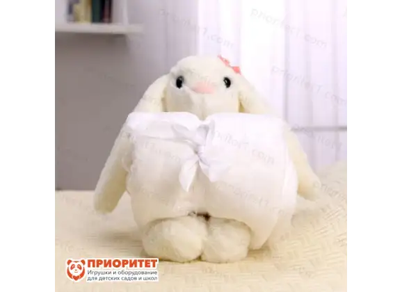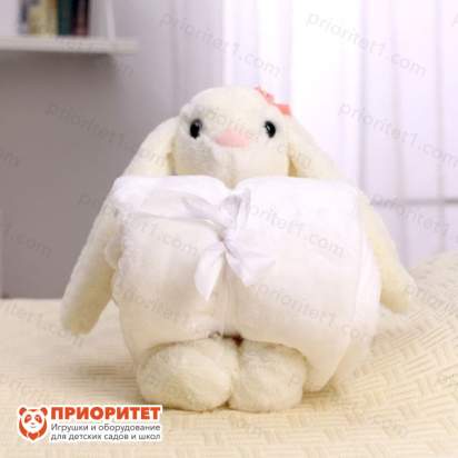 Набор станет хорошим подарком ребенку на праздник. Игрушка похожа на настоящего зайца с большими ушами и маленьким хвостом. Она украсит любое помещение, а теплый плед согреет в холодную погоду. Мягкая поверхность изделий подарит приятные тактильные ощущения.