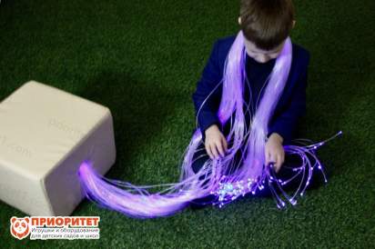 Мягкий кубик с пучком волокон представляет собой универсальный модуль для работы с детьми. Его мягкий корпус соединён с 100 светящимися фиброоптическими волокнами, что делает его идеальным для оформления сенсорных комнат. Внутри конструкция защищена дополнительной защитой, чтобы исключить доступ детей к аккумулятору. Для начала работы с этой мягкой тумбой достаточно подключить её к источнику питания. Цвета волокон меняются автоматически.