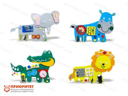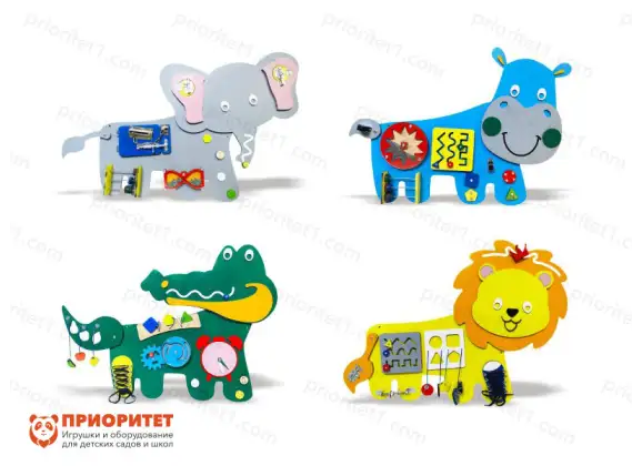 Набор бизибордов «Африканские жители» подходит для детей в возрасте от 1 года. В наборе 4 зверушки: слон, лев, крокодил и бегемот, каждый из которых, наполненные различными по функциональности и по сложности заданиями. Здесь есть: шнуровки, мебельные колесики, дорожки, тактильные элементы, циферблат часов и песочные часы, замочки и счеты.