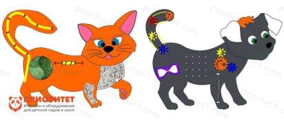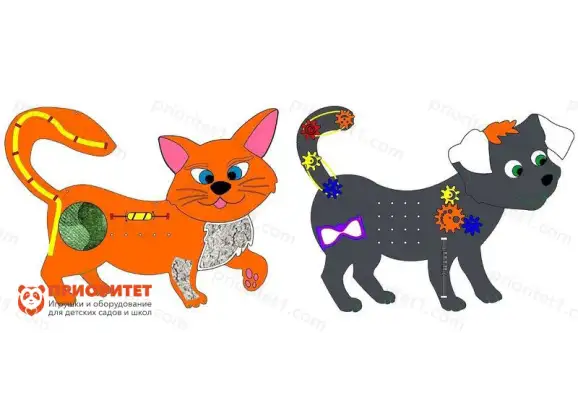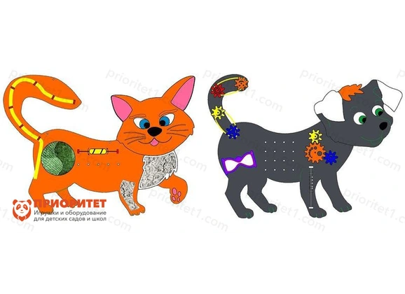 - Бизиборды выполнены в виде домашних животных: котенка и щенка, которые хорошо знакомы детям – каждый имеет приятный дизайн, с доброжелательными мордочками и яркой шерсткой.