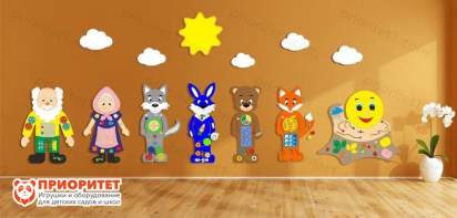 Установите бизиборды так, чтобы можно было разыграть детскую сказку. Повторите с детками сказку, а потом проведите занятие, изучив элементы на панелях.