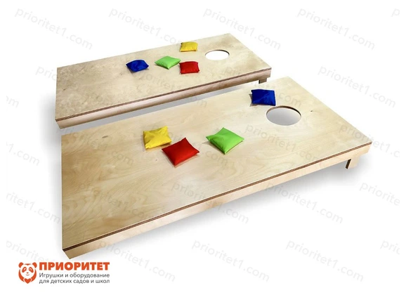 «Корнхол. Спорт» – это уличная игра, предназначенная для развития точности и силы броска у малышей. Представляет собой две деревянные доски с отверстиями, в которые необходимо закинуть цветной мешочек. Дети делятся на две команды и соревнуются в активном и веселом занятии: целятся, кидают и набирают очки.