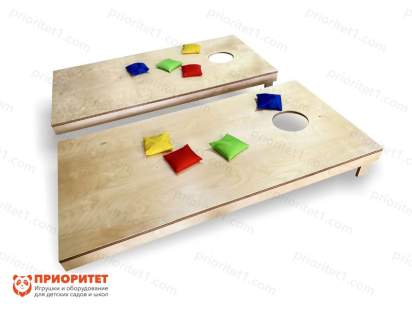 - Доски для игры сделаны из натуральной фанеры: поверхность тщательно отшлифована и покрыта лаком, чтобы мешочек легко скользил и усложнял прохождение игры. Мешочки сделаны из канваса и наполнены зерном, чтобы увеличить вес.