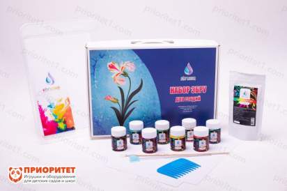 - В данном комплекте есть все предметы, необходимые для занятия: лоток, бумага, краски, кисти, загуститель и шило. Можно докупать вспомогательные предметы, облегчающие рисование, например, тематические заготовки.