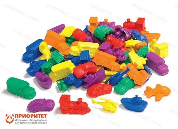 В состав входит 72 предмета в виде 6 разных типов фигурок: 12 легковых машинок, 12 грузовиков, 12 вертолетов, 12 кораблей, 12 самолетов, 12 паровозов.