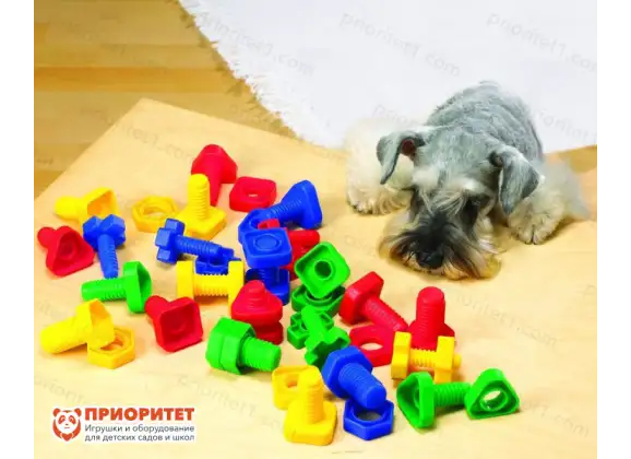 Очень занимательное занятие завинчивать гайки, совсем, как взрослый. Гайки и болтики в наборе сделаны из пластика, размер хорошо подходит для детских рук. Завинчивая гайки, ребенок тренирует мелкую моторику, а значит развивает мозг. Детали яркие и разноцветные, с их помощью можно изучать цвета и учиться классифицировать предметы по определенному признаку. Шляпки болтиков сделаны в виде геометрических фигур, что дает возможность проводить еще один вид сортировки. Большое количество деталей позволяет использовать набор в группе, к тому же он полностью соответствует ФГОС.