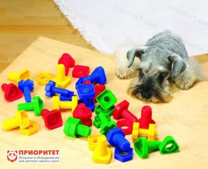 - Большие разноцветные болтики, длиной 6 см, представлены в четырех цветах и четырех формах, они прочно и легко соединяются между собой с помощью резьбы. Играя с ними, ребенок учится точности и координации движений
