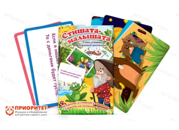 Оригинальный набор обучающих карточек «Стишата-малышата» – отличное подспорье педагогам, логопедам и родителям для развития речи, памяти и фантазия детей. Рассчитан на детей от 3 лет. Подходит для занятий в детских садах, школах, других образовательных, развивающих или коррекционных учреждениях, а также дома.