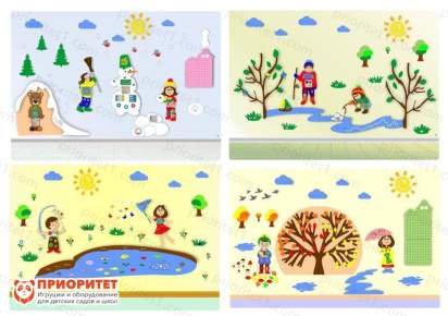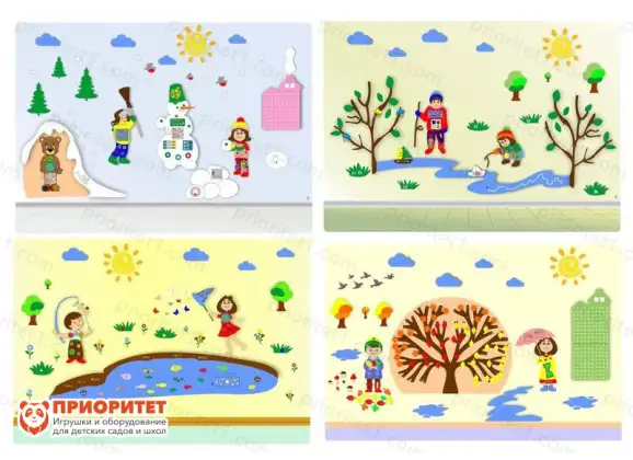- Решения выполнены в виде сезонных пейзажей, с которыми дети могут изучить особенности каждого времени года. Включают шестеренки, бегунки, лабиринты, шнуровку и пр.