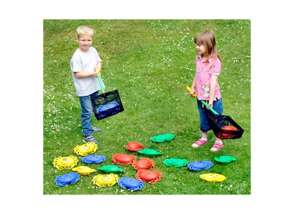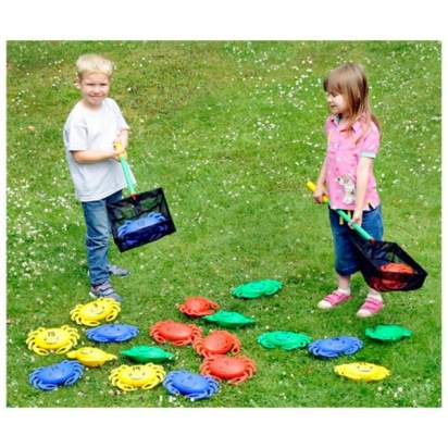 Набор «Крабы» предназначен для проведения активных игр на улице. Представляет собой набор пластиковых крабов, которых разбрасывают по земле, а затем – ловят сачками. В процессе игры дети не только активно проводят время, но и учат цифры и запоминают новые цвета.