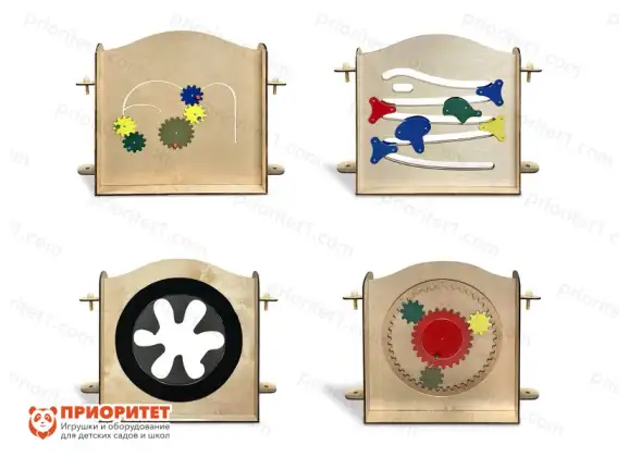 - Панель «Шестеренки в лабиринте» стимулирует воображение и творческие способности. Малыш сможет самостоятельно сделать систему шестеренок, понять, как он двигаются.