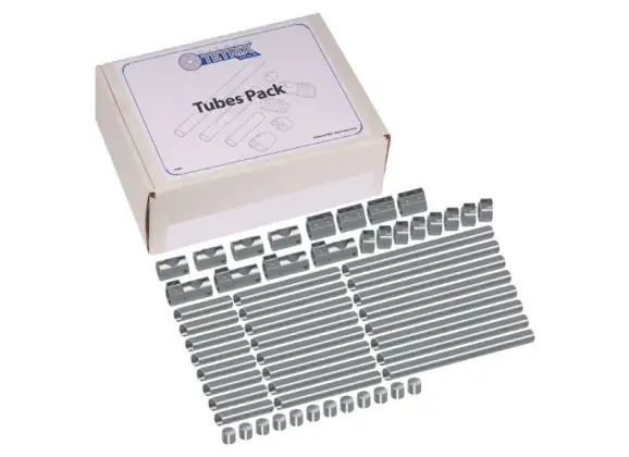 - Набор включает разные детали: трубки нескольких размеров – от коротких до длинных, угловые и анкерные блоки, муфты для объединения деталей, зажимы и упрочнители. Каждая деталь представлена в нескольких штуках. Можно использовать с другими наборами, подходящими по размеру.