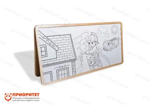 - Модуль 150см в ширину, 75см в ширину и 2см в толщину устанавливается на пол. Это позволяет с комфортом заниматься сразу небольшой группой, распределяя элементы раскраски между участниками. Например: один малыш может раскрашивать дом, второй – человека в костюме, а третий – машину экстренной службы;
