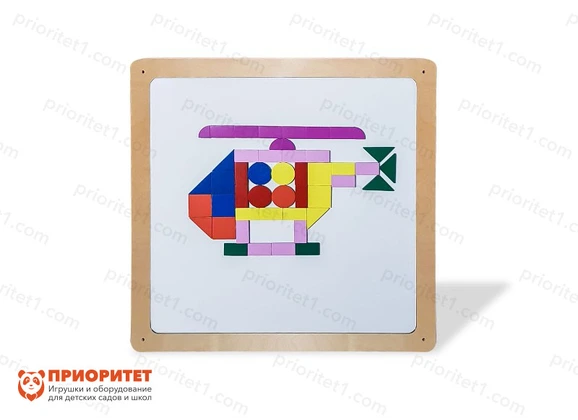 Настенная игра «Мозаика» используется для игры и обучения детей дошкольного возраста. Игра произведена из безопасных материалов: фанеры и пластика. Конструкция лишена острых углов. Фигуры представлены в разных формах форме треугольника, круга, квадрата, прямоугольника, окрашены в красный, желтый, фиолетовый, синий и черный. С обратной стороны деталей магнитное покрытие, которое прочно держится на доске.