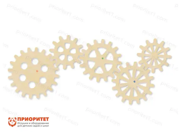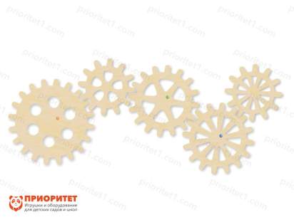Модуль состоит из 5 деревянных зубчатых колес разного диаметра и вида. Набор используется для изучения принципа зубчатой передачи, обучению и формированию навыка вращательных движений в плоскости.