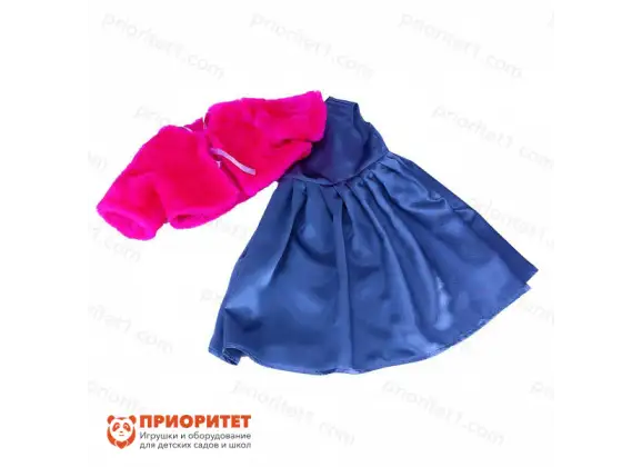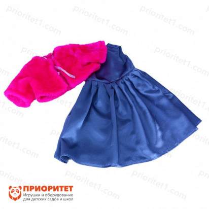 - Праздничный комплект включает длинное платье без рукавов и в синем цвете, а также меховую накидку, которая завязывается спереди атласной лентой – в наряде используются яркие цвета, которые хорошо дополняют друг друга: розовый создает ощущение праздника и веселья, а синий приглушает композицию.