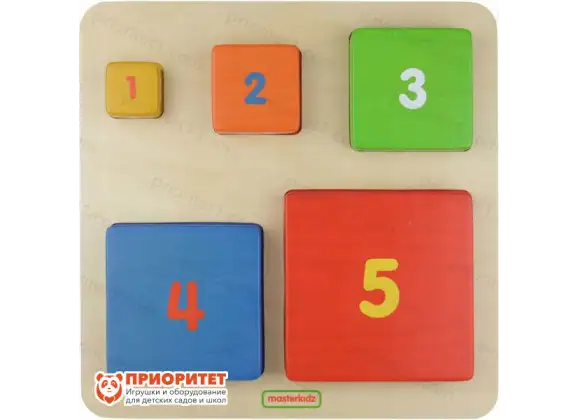 Игровой набор состоит из деревянной панели с квадратными выемками. Им соответствуют 5 деревянных квадратных блоков разного цвета и размера. На каждый из блоков нанесена цифра от 1 до 5.