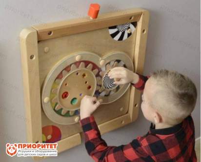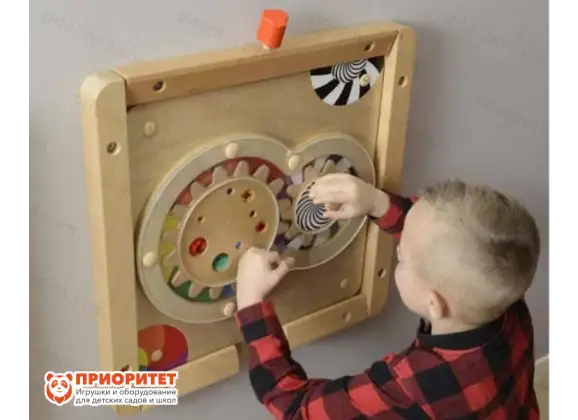 Деревянная панель с двумя шестернями, которые можно вращать за ручки. Шестерни украшены красочными камнями, а на саму панель нанесены разные цвета. Ее можно расположить дома, а можно использовать в дошкольном учреждении.