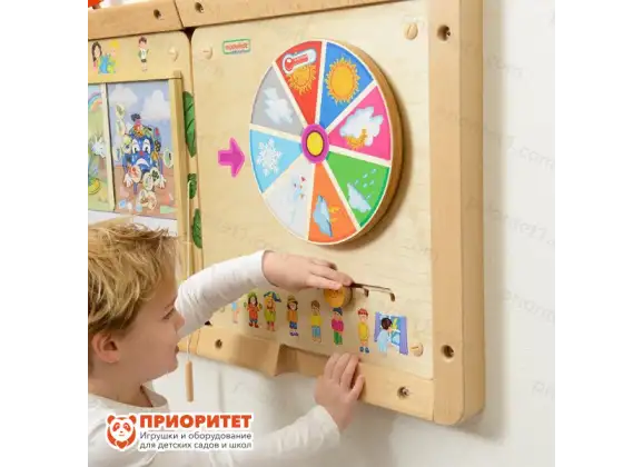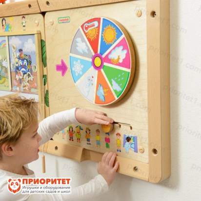 Панель представляет собой лист березовой фанеры размером 46х46х3,8 см, с закрепленным в центре крутящимся колесом. На нем в 8 ярких разноцветных секторах изображены погодные условия. С левой стороны от колеса – стрелка для выбора сектора. Внизу – восемь рисунков с изображением детей в разной одежде. Над ними – бегунок-смайлик, с помощью которого малыш будет выбирать одежду, соответствующую погоде.
