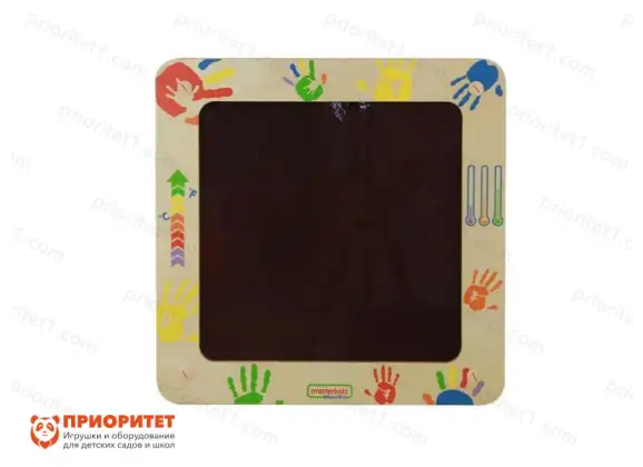 Панель может измерять температуру тел, которые прикасаются к её поверхности. В местах соприкосновения остаются отпечатки с цветом, соответствующим температуре. Детям понравится играть с панелью, потому что на ней остаются следы, которые исчезнут спустя несколько секунд. Рамка панели изготовлена из фанеры и разрисована цветными отпечатками детских ладоней, это повышает настроение, делает его весёлым и позитивным. Панель предназначена для детей, достигших возраста 3 лет.