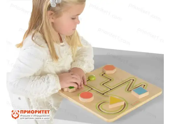 Панель “Загадочный Лабиринт” — это развивающая игрушка для детей от 2-х до 7-ми лет. Изготовлена из натуральной фанеры, с применением безопасных для детей материалов. В фанере выполнены специальные прорези, внутри которых передвигаются бегунки. Бегунки исполнены в виде простых геометрических фигур: треугольник, круг, крест, квадрат и шестиугольник. Игра тренирует ловкость, мелкую моторику, основана на тактильных ощущениях. Чтобы игровой процесс был эффективнее, можно предложить ребёнку пользоваться обеими руками одновременно. Суть подобных лабиринтов в том, чтобы переместить любую фигуру в любое желаемое место.