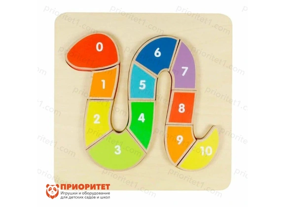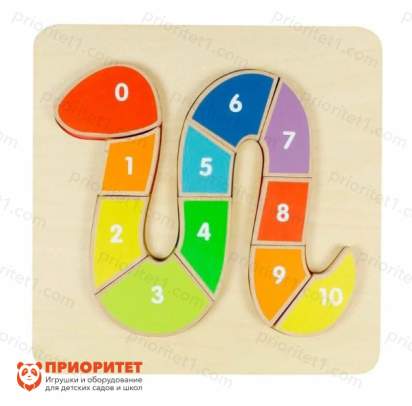 Игровая панель состоит из плоского деревянного основания, в котором расположена выемка в форме змеи. В комплект входят 11 разноцветных деталей. На них нарисованы цифры от 0 до 10. Все фрагменты последовательно собираются в фигурку змеи.
