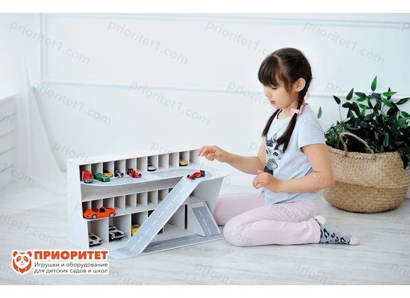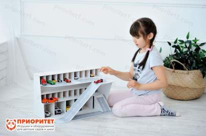 Парковка представляет собой многоярусную конструкцию для игры и хранения маленьких машинок. Большое количество секций позволяет убрать сразу все игрушки, а игровая форма с заездами и пешеходными переходами сделает уборку интересней. Применять «Гаражик» можно в детских садах, развивающих центрах и даже дома.