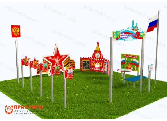 Патриотическая площадка «Центр патриотического воспитания юных патриотов» — это уникальный масштабный уличный комплекс, созданный для образовательных учреждений. Его основная цель — воспитать у детей чувство гордости за свою страну, развить патриотизм и знание о главных государственных символах и исторических событиях. Площадка идеально подходит для работы с дошкольниками и младшими школьниками, делая обучение увлекательным и интерактивным.