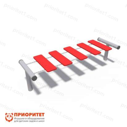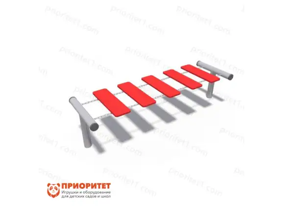 Конструкция представляет собой 2 опоры, между которыми протянут подвесной мост. Крепкие соединения позволяют заниматься не только детям, но и взрослым. Пешеходный мост выполнен в виде перехода, между досками есть расстояние, поэтому каждая из них является отдельным элементом. Мост можно установить на детской или спортивной площадке, на территории развивающего центра или частного дома.
