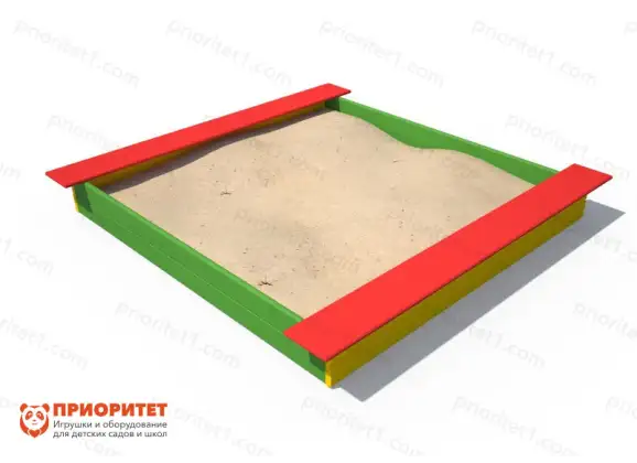 - Песочница сделана в стандартном виде: квадратная форма и разноцветный окрас, который привлекает детей к игре и поднимает настроение.