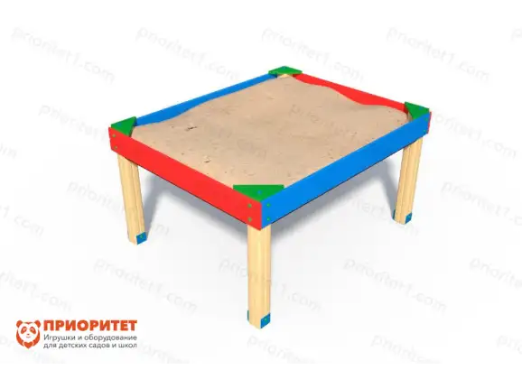 - Песочница имеет квадратную форму и покрашена в яркие цвета, чтобы привлечь внимание детей и побудить их запомнить цветовую палитру.