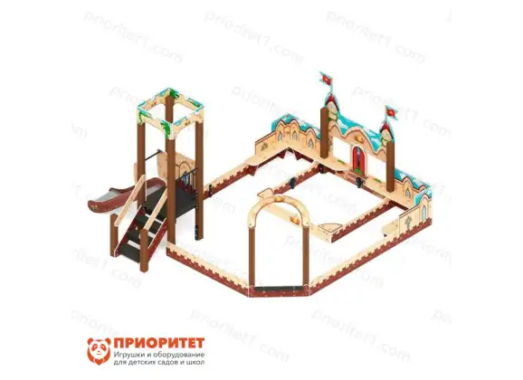 Детский игровой развивающий комплекс, стилизованный под замок. В нем есть горка, песочница и ограждение со скамеечками. Оформление привлекает внимание детей и ассоциируется со сказками. В такой обстановке детям будет легко фантазировать и примерять на себя роли сказочных героев.