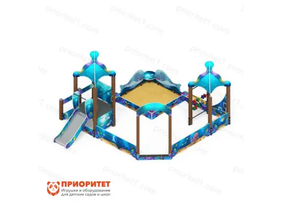 Модель оформлена в морской теме. На бортиках изображен подводный мир и его обитатели. Картинки интересно разглядывать и делиться впечатлениями. Песочницу украшают две фигуры дельфинов. Дворик привлекает внимание, вызывает положительные эмоции и поднимает настроение. Это подходящее место для знакомства со сверстниками, общения и адаптации детей в социуме.