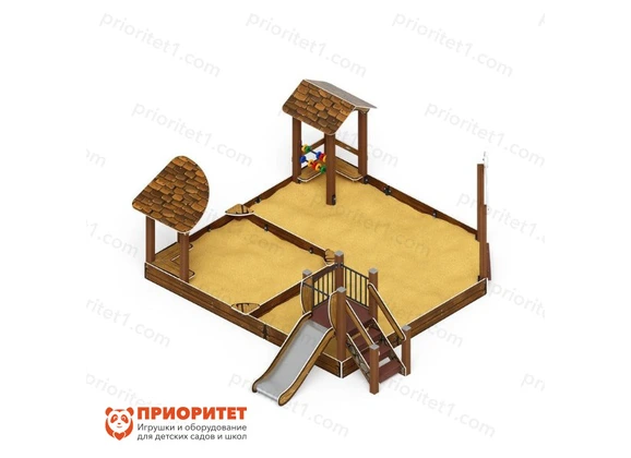 Песочный комплекс для уличной детской площадки, с двумя беседками со скамеечками, горкой и входом. Модель в коричневом цвете. Природное оформление будет хорошо сочетаться с зелеными растениями в парках и скверах. Зона разделена на две песочницы, которые наполняются сухим, просеянным песком. Одновременно в песочном дворике могут играть несколько детей.