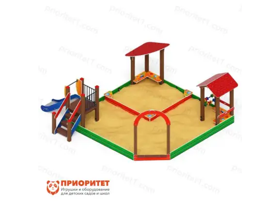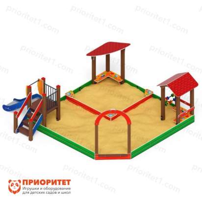 Конструкция представляет собой модульную игровую песочную зону для детей. Модель включает в себя большую и маленькую песочницы, две крытые беседки со скамеечками, разноцветные деревянные счеты и горку. Такой песочный дворик украсит и разнообразит любую детскую игровую площадку. В нем найдется место для малышей и детей постарше.
