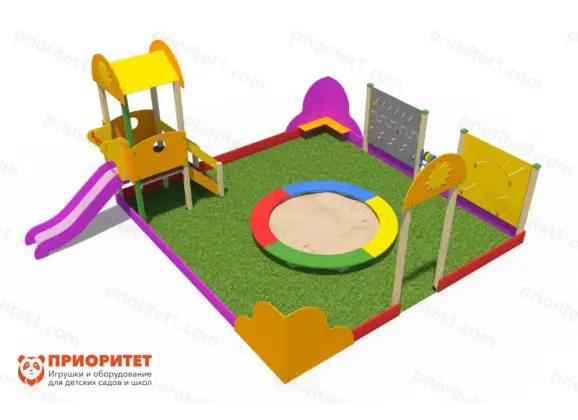 - Конструкция с песочницей. Песочница круглая, окрашена в цвета радуги. Бортики песочницы можно использовать как скамью или подставку для игрушек. Играть с песочницей может до пяти детей одновременно.