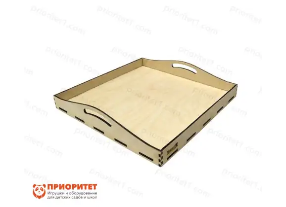 - Поднос изготовлен из натуральной фанеры. Материал тщательно обработан и покрыт экологически чистыми защитными пропитками для древесины. Острые углы закруглены, поэтому ребёнок не поцарапается. Игрушка совершенно безопасна.