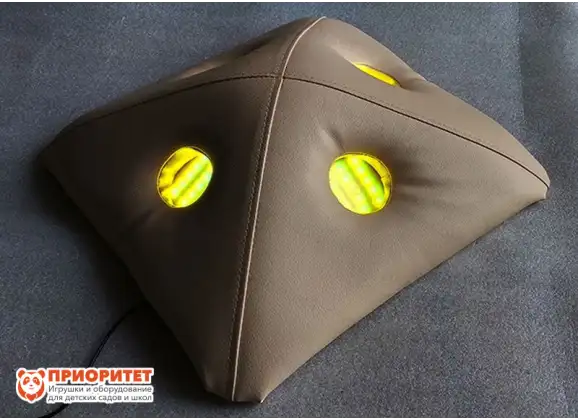 Подсветка для сухого бассейна – деревянная пирамида с поролоновыми подложками, обтянутая экокожей, внутри которой установлены световые элементы. Отверстия пирамиды защищены акриловым стеклом, оно не бьется и не наносит вреда здоровью. Подключение пирамиды осуществляется через адаптер. Рабочее напряжение составляет 12 вольт, что абсолютно безопасно для здоровья.