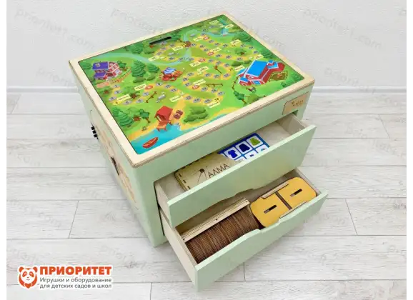 Куб имеет колеса, что позволяет без труда перемещать его по кабинету, внутри сложены все игры, поэтому комплект можно считать компактным.