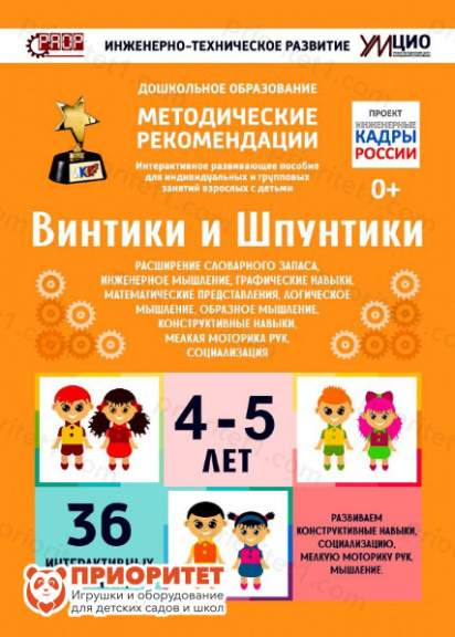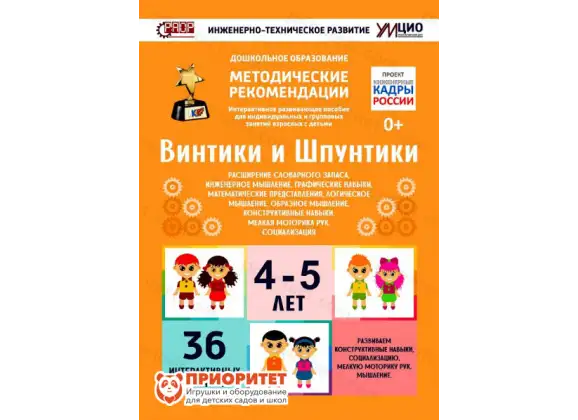 Программно-методический комплекс «Винтики и шпунтики» разработан лучшими российскими педагогами и направлен на общее развитие и приобретение математических навыков. В комплект входит все необходимое для проведения интерактивных занятий с детьми 4-5 лет в течении года. Для занятий также пригодятся дополнительно конструкторы Lego «Первые механизмы» или UARO.