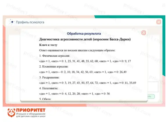 Автоматизированное рабочее место «Профиль психолога» позволяет создавать карточку специалиста, вести отчётность по его работе и настроить необходимые параметры. Программа имеет большое количество тестов, анкет и опросников на выявление нарушений зрительной памяти, проявления агрессии, диагностики детских страхов, шкалы тревожности, особенности эмоционального развития ребенка.